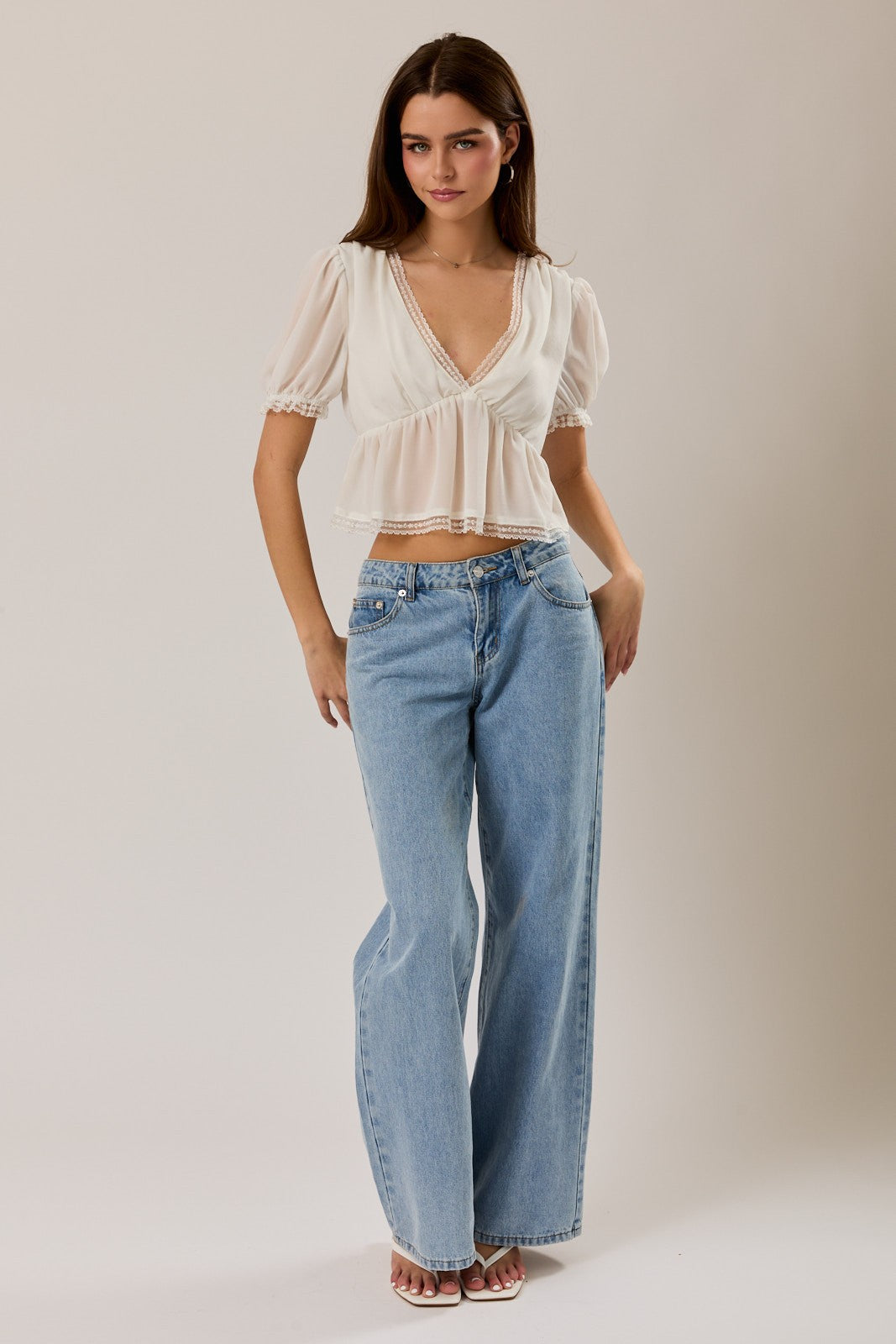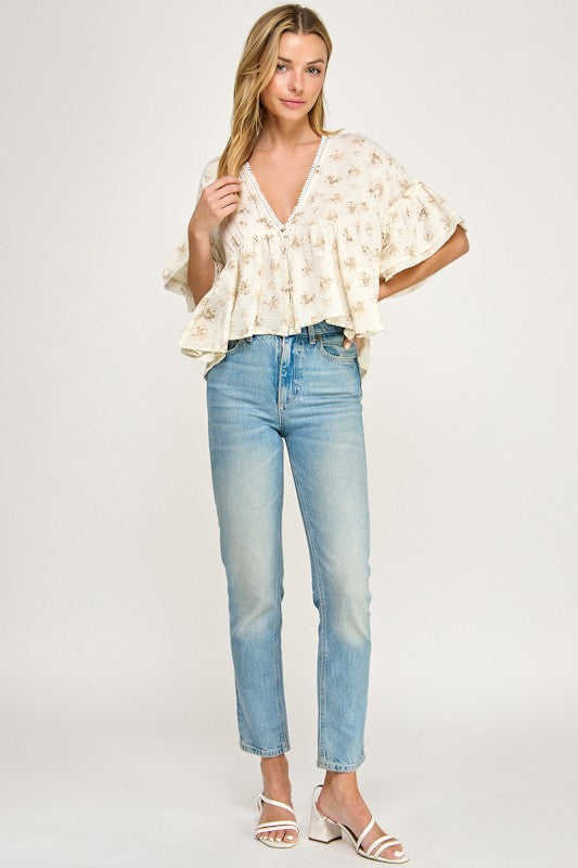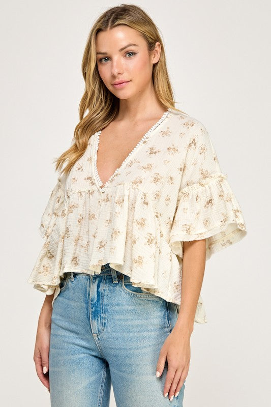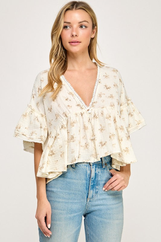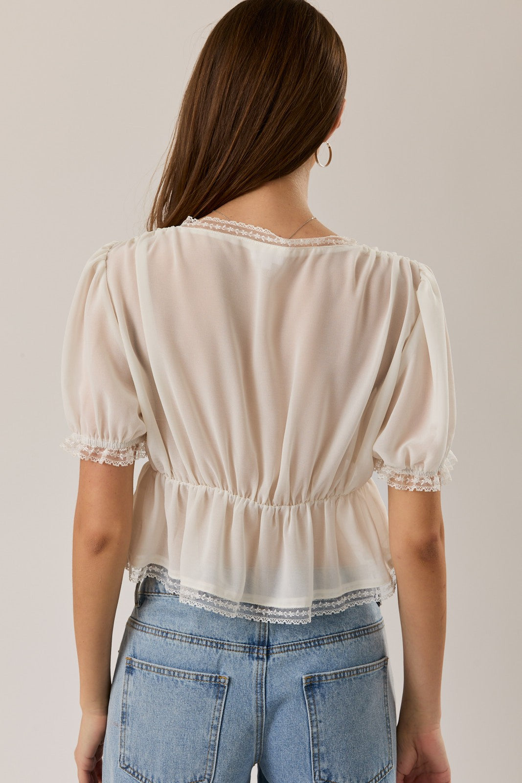 Puff Sleeve V Neck Lace Trim Top