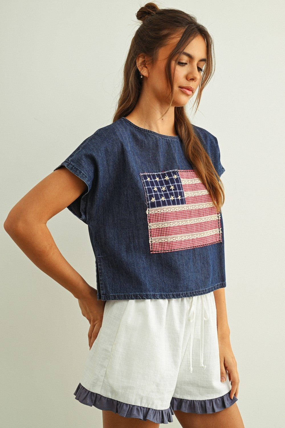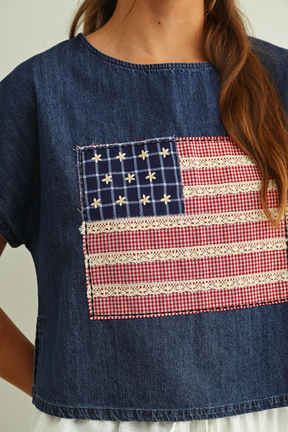 Mixed Fabric Flag Patch Dolman Slv Top