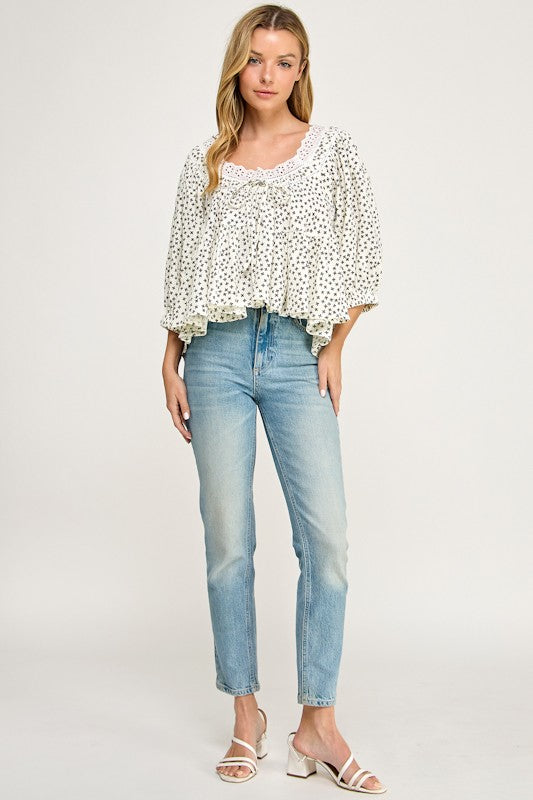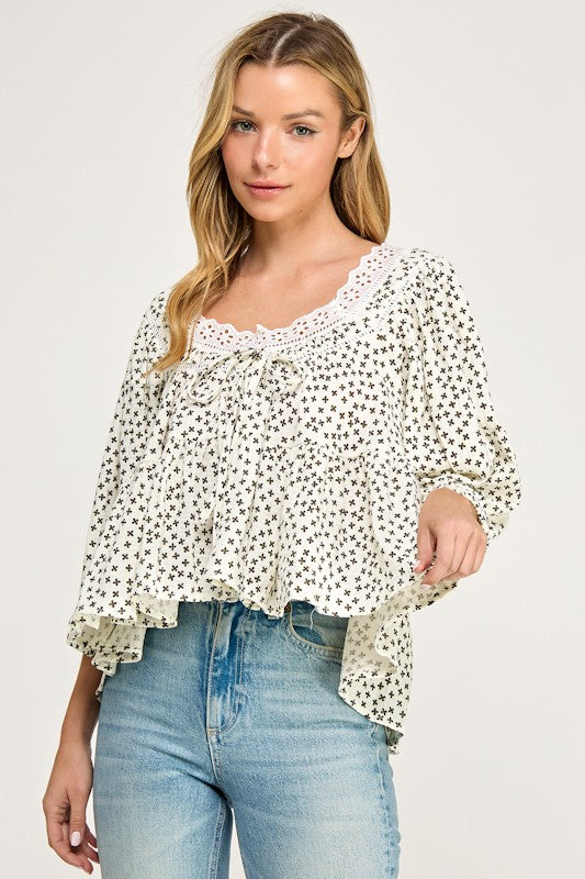 Ditsy Print Lace Trim Tiered Blouse